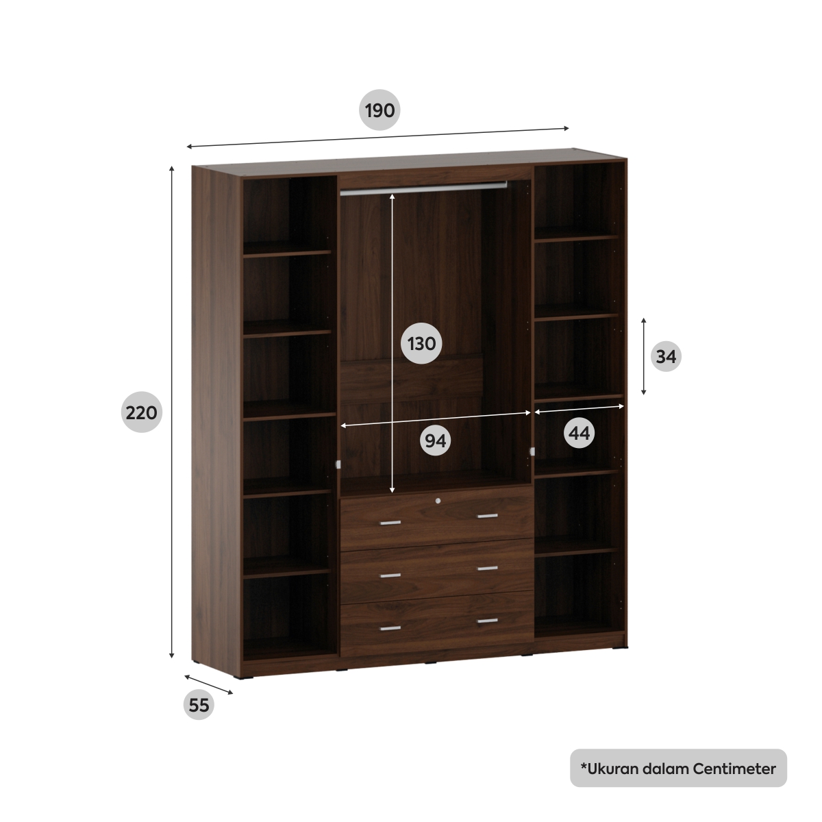 * Metal handle * Dilengkapi dengan laci sebagai tempat penyimpanan tersembunyi dan juga bebas debu * Rak dapat disesuaikan dengan penyimpanan yang anda butuhkan * Jumlah rak baju sangat banyak * Ketebalan papan 15 mm * Material tebal, kokoh dan kuat * Ukuran lemari cukup tinggi dan besar