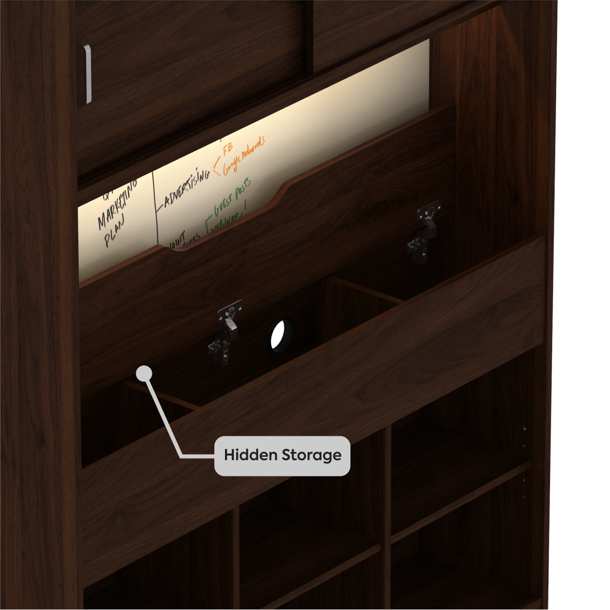 • Ergonomic desk, tinggi top table nyaman sesuai anthropometri orang kerja • Media kerja yang luas dan nyaman • Tepi meja curvy, nyaman saat bekerja • Pijakan kaki yang luas • Rak terbuka untuk menyimpan peralatan kantor agar lebih rapi • Hidden storage dengan bukaan pintu flap pada rak buku • Terdapat white board / papan tulis, memudahkan dalam menulis pada rak buku