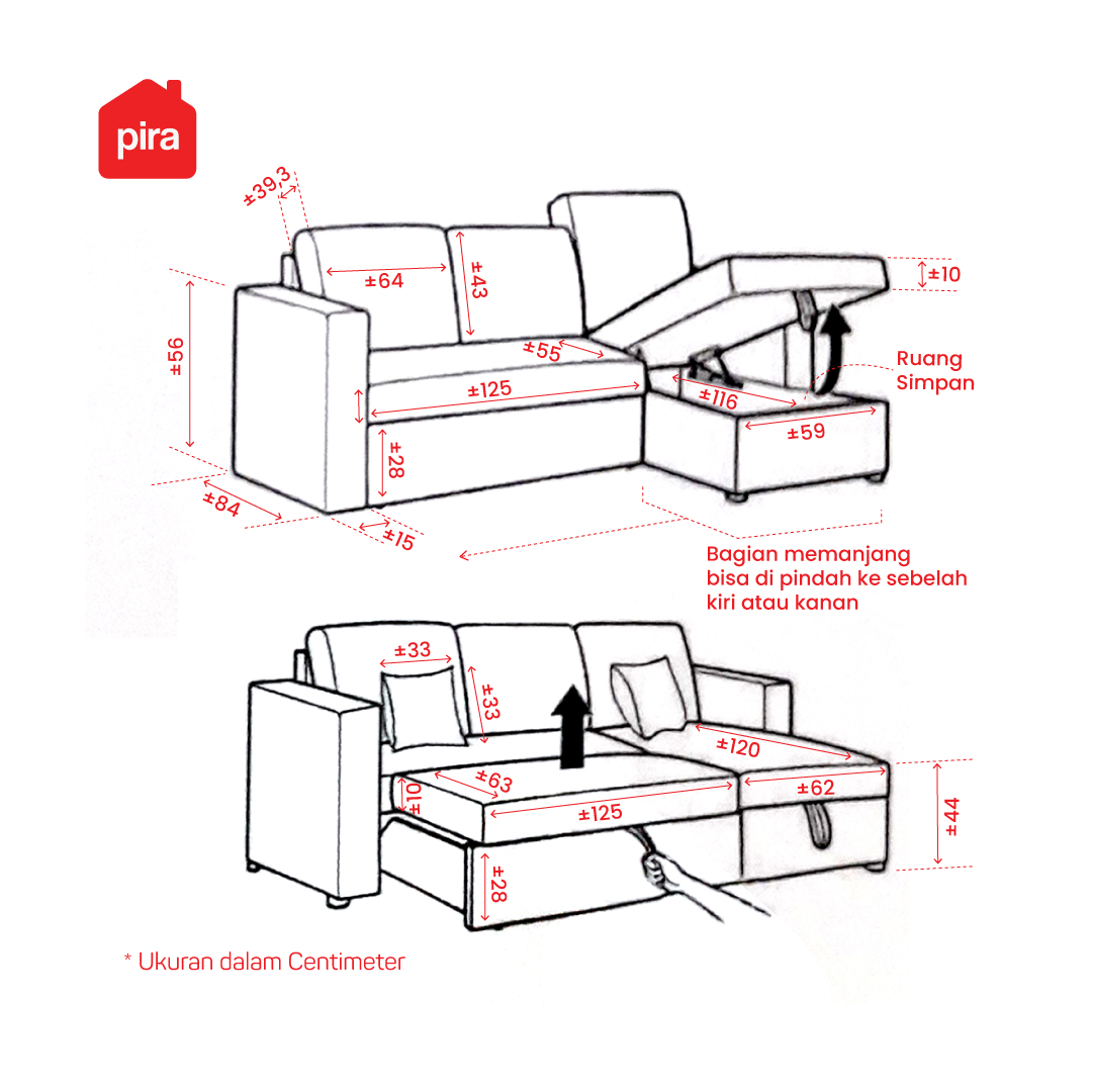 • Sofa multifungsi dengan hidden storage • Berbahan fabric lembut dengan jahitan rapi • Bantalan sofa empuk, lebih nyaman saat digunakan • Cocok digunakan untuk bersantai di ruang keluarga atau untuk membaca buku dengan nyaman • Memiliki hidden storage, untuk menyimpan selimut, bantal, dan barang lain agar terlihat rapi • Sofa dapat ditarik dan dijadikan kasur, solusi untuk beristirahat dengan space yang lebih luas • Dilengkapi roda, membantu menarik sofa lebih mudah • Posisi panjang sofa (chaise) dapat dipindahkan di kanan atau kiri sesuai kebutuhan • Bagian kaki sofa tinggi, membantu membersihkan area bawah sofa lebih mudah • Dikirim dalam flatpack namun mudah dirakit, tersedia petunjuk + video tutorial di YouTube • Tersedia jasa perakitan di area JABODETABEK, Surabaya, Sidoarjo dan Gresik • Garansi 14 hari, syarat & ketentuan berlaku
