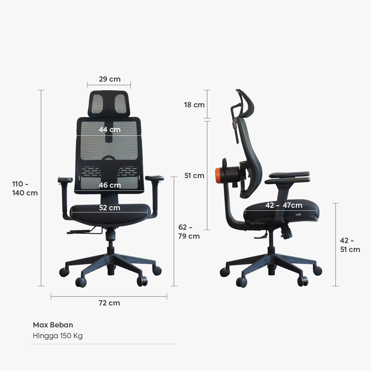 • Kursi berdesain punggung tinggi (High Back Office Chair) • Adaptive Lumbar Support, mengikuti gerakan punggung lekuk S tulang belakang secara dinamis • Empat tingkat kemiringan (recline) bisa dikunci: 96°, 116°, 126°, hingga 136° • Adjustable backrest, dapat ditinggikan hingga ~5–6 cm untuk menyesuaikan ketinggian tubuh pengguna • Kedalaman dudukan (seat depth) dapat disesuaikan sekitar 5 cm agar sesuai panjang paha pengguna • Rangka dan bahan: sandaran berbahan mesh untuk sirkulasi udara, gas lift kelas 4 (KGS/class-4) bersertifikasi • Adjustable armrest, tinggi dan maju/mundur • Rekomendasi beban maksimum: sekitar 150 kg